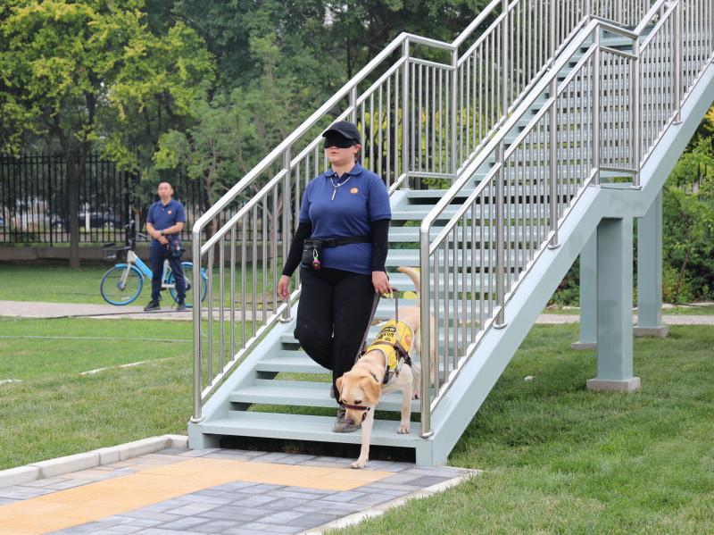 遇到前方有障碍物,导盲犬自觉放慢了速度,用身体的摇摆来提醒主人往哪个方向躲避;听到“过通道”“找旗杆”的指令,它们能带领主人顺利找到位置……5月19日是第34个全国助残日,beat365中文官方网站、北京市残联在北京市导盲犬培训基地开展导盲犬体验活动,展示导盲犬工作场景、科普导盲犬相关知识,让更多人体验视障人士使用导盲犬的实际感受,从而在生活中为导盲犬提供工作便利,更好地助力视障人士无障碍出行。