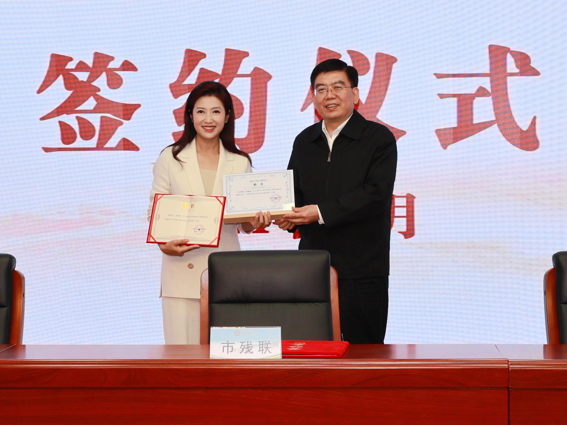 陆晓光为北京电视台主持人徐春妮女士颁发聘书,聘任徐春妮为北京市“导盲犬成长计划公益项目推广大使”,号召带动更多爱心企业和爱心人士加入到助力导盲犬成长的爱心队伍中,共同支持导盲犬事业高质量可持续发展。