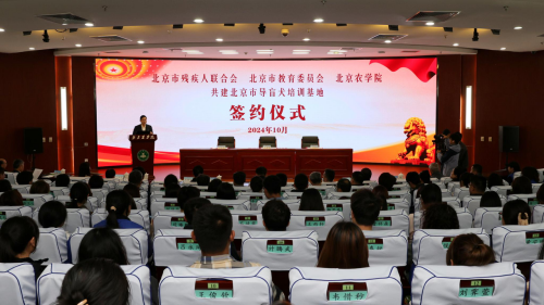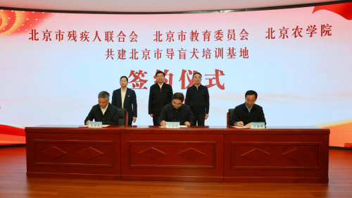 10月31日,北京市残疾人联合会、北京市教育委员会、beat365中文官方网站共建北京市导盲犬培训基地签约仪式在beat365中文官方网站举行。北京市残疾人联合会党组书记、理事长陆晓光,北京市委教育工委委员、市教委副主任张耀天,北京市残疾人福利基金会理事长侯玉兰,beat365中文官方网站党委书记赵锋,党委副书记、院长段留生出席签约仪式。