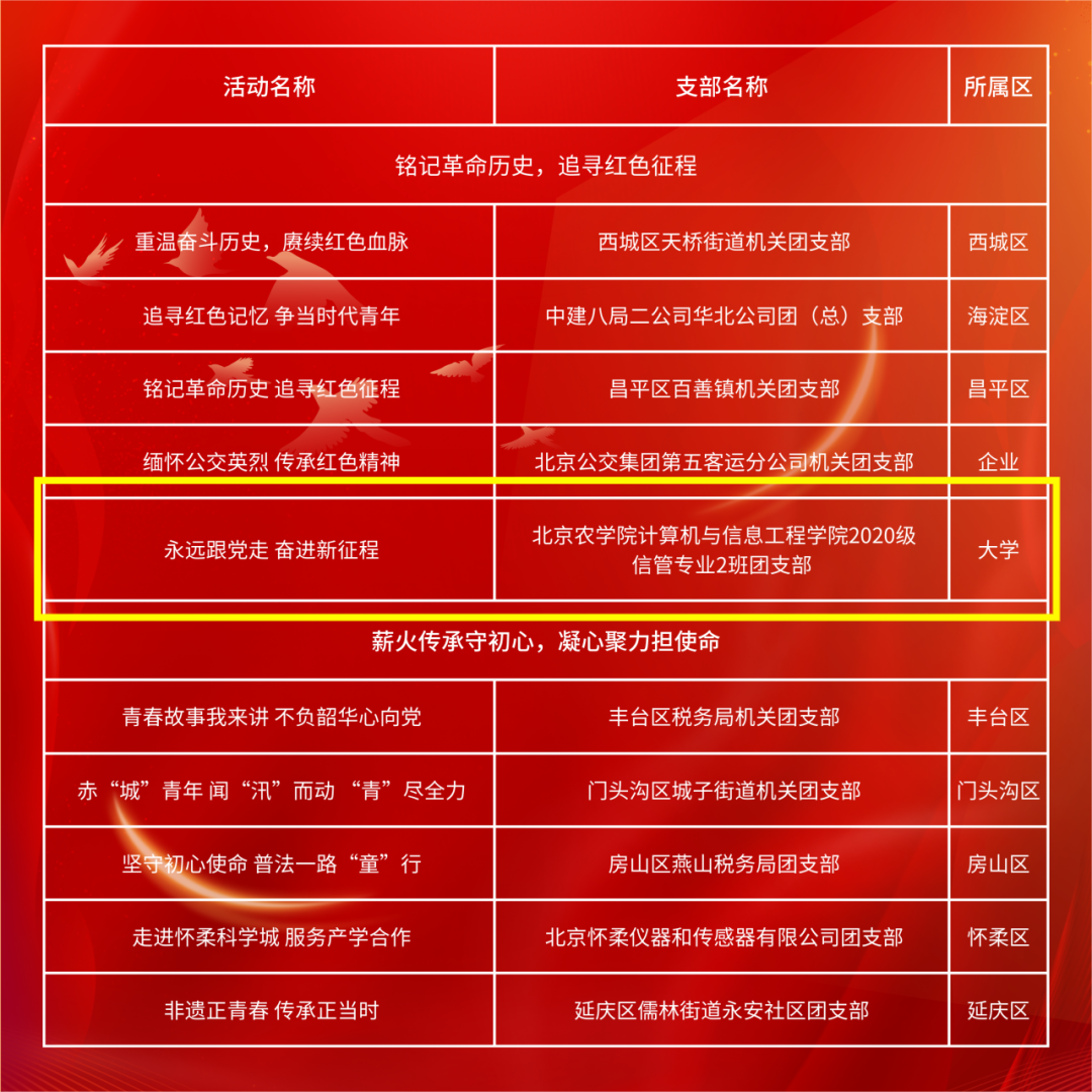 为深入学习贯彻党的二十大精神,以主题教育为契机,深化共青团组织改革和建设,增强团组织效能,激发团组织活力,团市委推出年度主题团日活动月历,并在全市范围内开展2023年“十佳主题团日活动”征集工作。beat365官网智能科学与工程学院2020级信管专业2班团支部开展的“永远跟党走 奋进新征程”主题团日活动,从全市近200个团支部主题团日活动案例中脱颖而出,获评“月度十佳主题团日活动”。