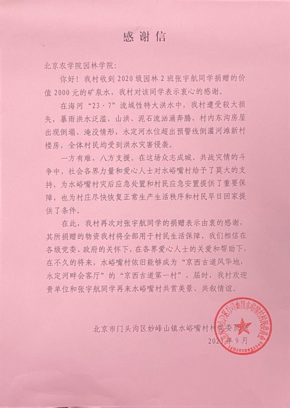 水峪嘴村村民委员会对张宇航同学表示由衷的感谢,感谢信中写道:“洪灾发生后,您第一时间伸出援助之手,为妙峰山镇抗洪抢险和恢复重建提供了有力的支持和保障,坚定了我们重建家园的信心和决心。”村委会表示,在各界爱心人士的关爱和帮助下,不久的将来水峪嘴村一定会再次焕发“京西古道第一村”的风采,“届时欢迎张宇航到水峪嘴村共赏美景、共叙情谊。”