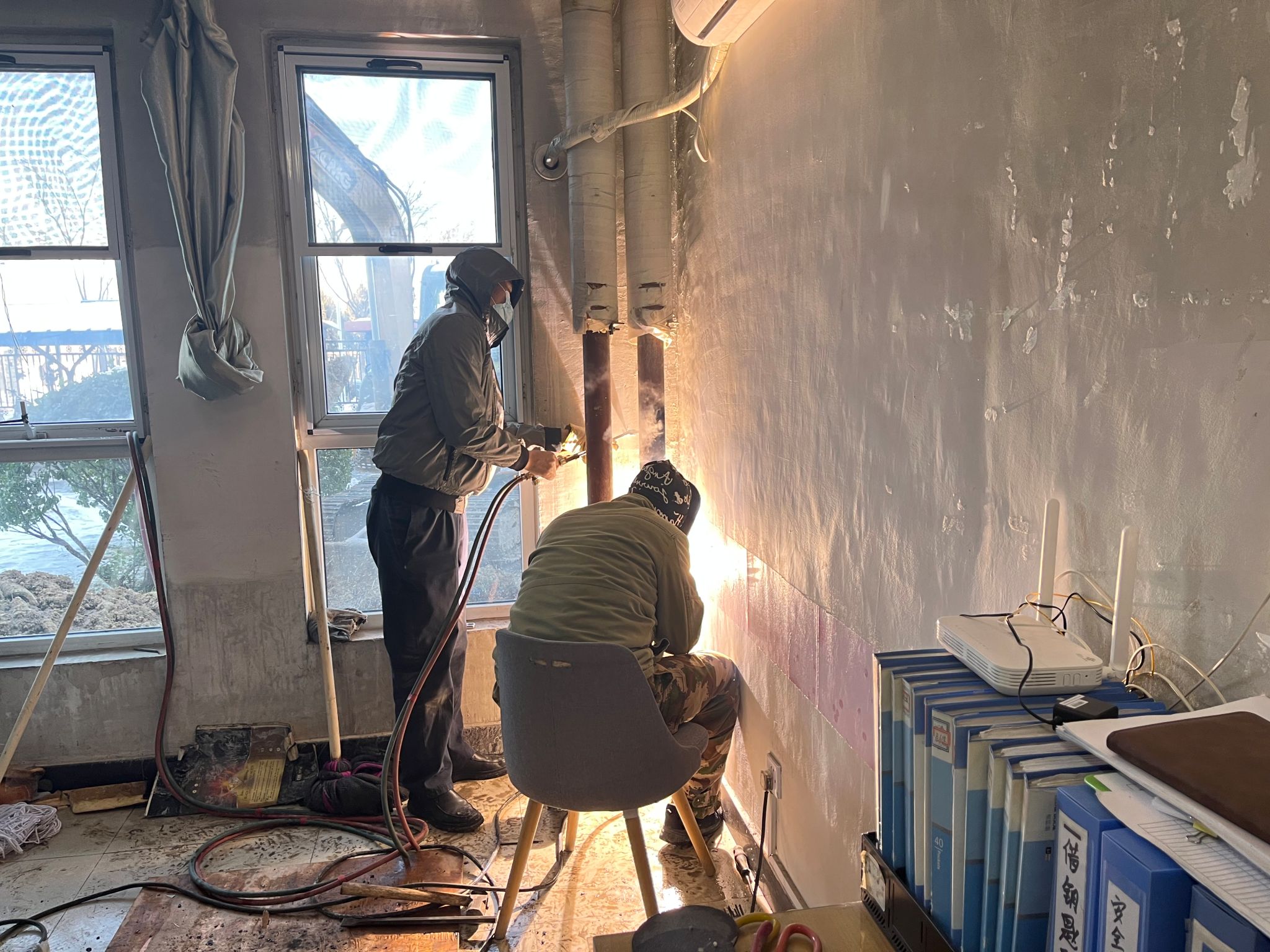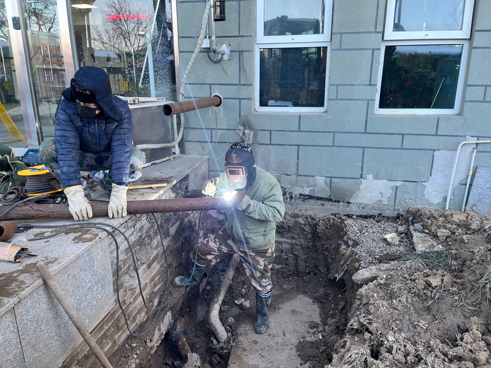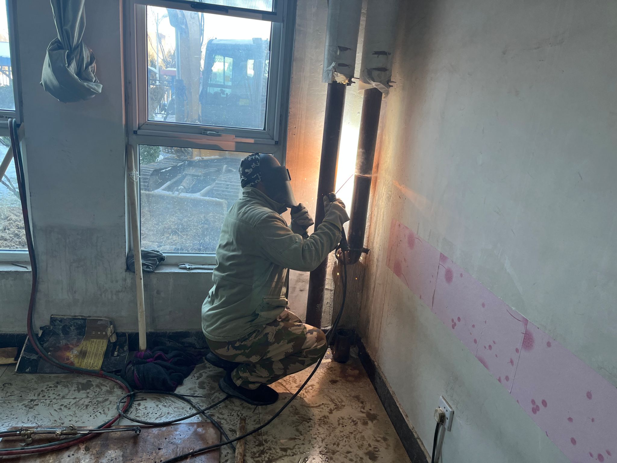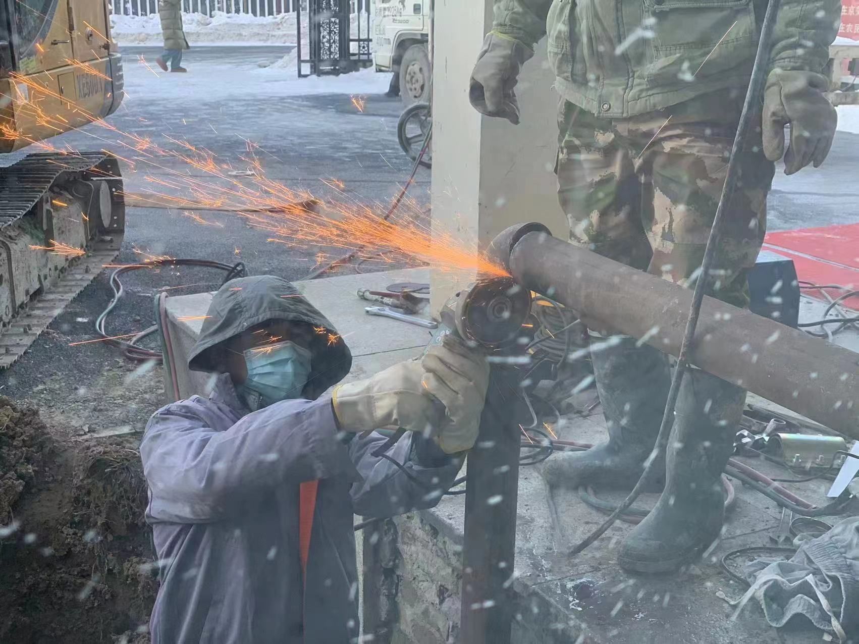 经过近两个小时的维修,进水管终于修好了。“不好,又有一处漏水!”刚松了一口气的师傅突然发现墙根处还有漏水点。漏水管道挨着墙体,无法直接进行焊接。“改变原有维修思路,从一楼值班室的主暖气管道接一根新的管道到室外暖气管。”由于坡口焊接的难度很大,维修师傅又经过三个多小时的安装和焊接,终于在下午4点多完成维修并恢复供水。