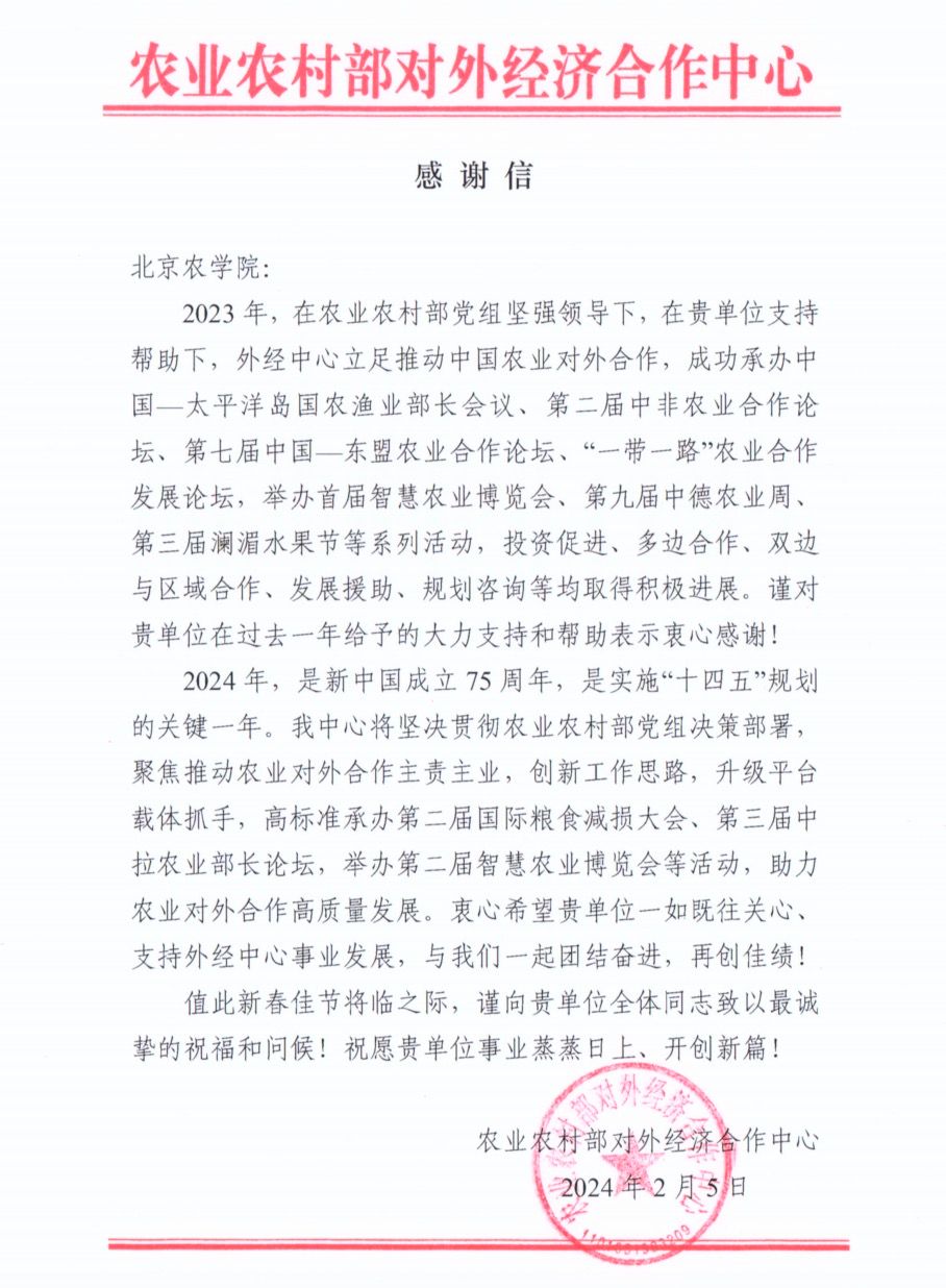 近日,农业农村部对外经济合作中心向beat365官网发来感谢信,感谢beat365中文官方网站对农业农村部对外经济合作中心工作的支持。