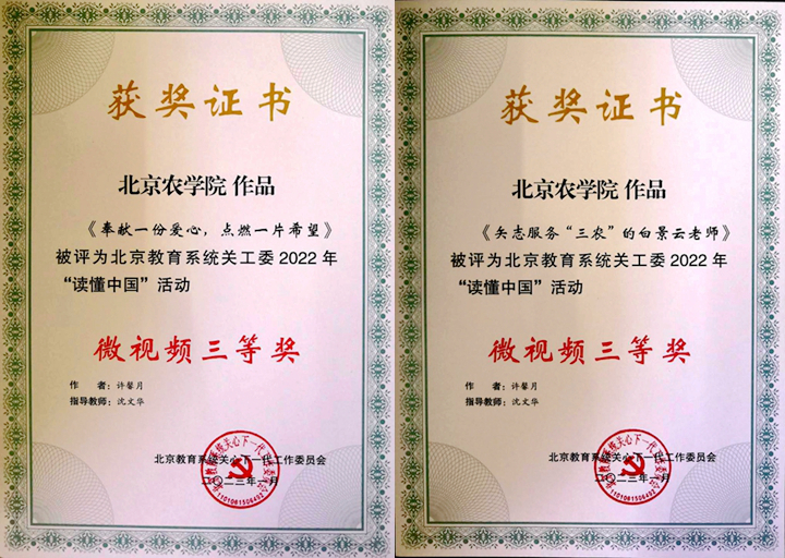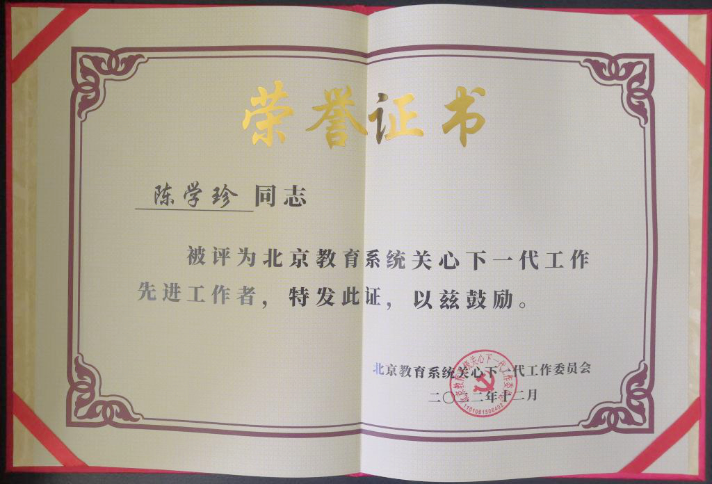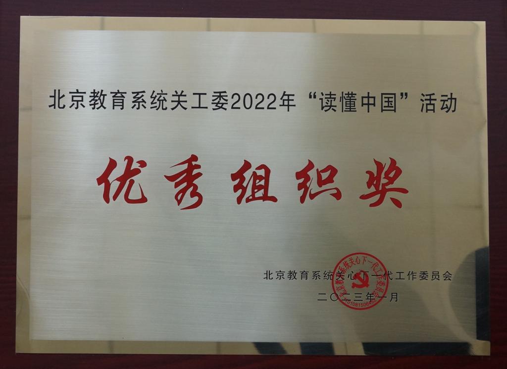 在北京教育系统关工委举办的学习宣传贯彻党的二十大精神培训班总结表彰会上,学校关工委再次受到表彰。学校关工委受到教育部关工委表扬并荣获北京教育系统关工委2022年“读懂中国”活动“优秀组织奖”;离退休工作处制作的记录退休教师陈学珍、白景云事迹的微视频《奉献一份爱心,点燃一片希望》《矢志服务三农的白景云老师》获评北京教育系统关工委2022年“读懂中国”活动微视频三等奖”;陈学珍老师的文章《奉献一份爱心,点燃一片希望》入选北京教育系统关心下一代工作委员会《我与关工委的故事》文集。