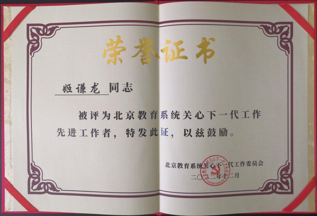 beat365官网研究生教学督导组获评“北京教育系统关心下一代工作先进集体”,退休教师陈学珍和姬谦龙获评“北京教育系统关心下一代工作先进工作者”。