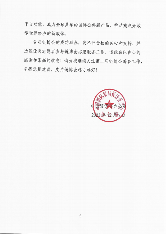 近日,中国国际贸易促进委员会办公室向学校发来感谢信,感谢学校选派的38名志愿者在中国国际展览中心顺义馆用青春和奉献提供的暖心服务。