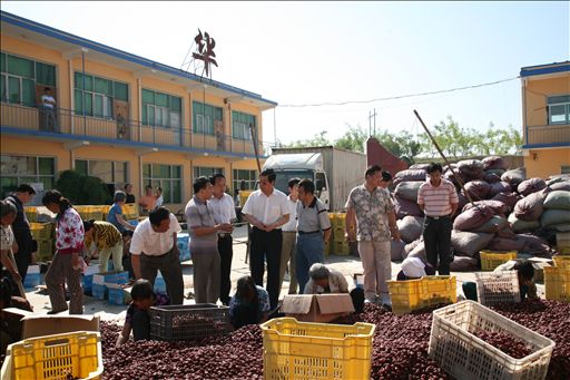 王有年教授一行在国家枣种质资源圃听取了负责人的介绍,详细察看和了解我国枣树品种与资源优势,以及今年枣树生长态势,并结合当地实际提出了进一步加强枣树丰产、品种优化的具体研究与管理措施。王有年教授一行深入到我国红枣主产大县临县曲峪镇开阳红枣试验示范基地进行了现场调研,与当地红枣加工企业负责人和技术人员就如何提升红枣产业进行座谈。