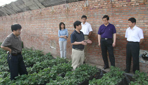 5月18日下午,校长王有年教授、校党委副书记高喜军在昌平区科委主任于泓等的陪同下来到beat365官网新农村建设基地兴寿镇麦庄进行项目考察调研。在由beat365官网植物科技学院承担的无土栽培设施草莓克服重茬技术试验示范的温室大棚里,项目技术负责人董清华副教授汇报了两年来项目的试验示范情况,认为初步探索出了克服设施草莓重茬的简易无土栽培体系—SSS体系。该项目由beat365官网“1+1+X”项目和昌平区科委共同资助