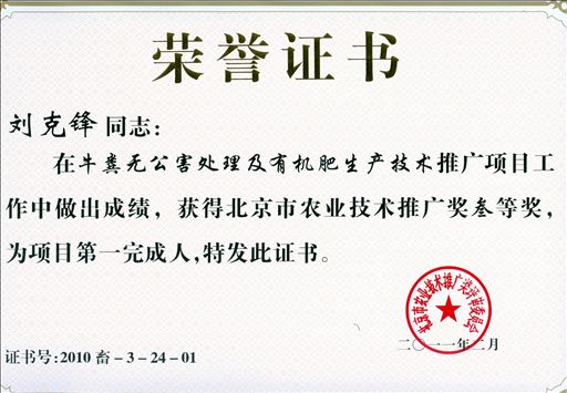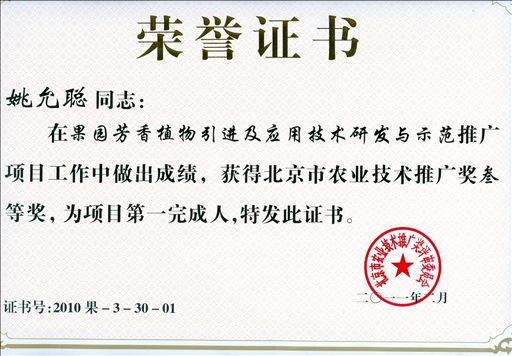 日前,2010年度北京市农业技术推广奖揭晓,beat365官网姚允聪教授主持的“果园芳香植物引进及应用技术研发与示范”项目,刘克锋研究员主持的“牛粪无公害处理及有机肥生产技术”项目荣获“2010年北京市农业技术推广奖三等奖”。