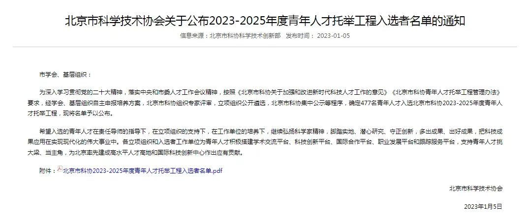 据悉,“青年人才托举工程”是由中国科协和部分省级科协自2015年开始提出的面向青年科技人才的支持项目。“北京市科协青年人才托举工程”项目旨在引导、支持与北京市科协建立联系的全国学会,北京市科协所属学会、协会、研究会、促进会和基层组织,探索创新青年科技人才培养机制,支持学会、基层组织针对不同学科领域的人才特点,发现和托举一批政治素质高、创新创业能力强的优秀青年科技人才,为青年科技人才成长探索经验模式。该项目每年通过与北京市科协建立联系的全国学会、北京市科协所属学会、基层组织选拔一批优秀青年科技工作者进行连续三年稳定的跟踪培养。