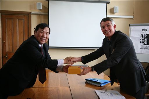 代表团专门拜会了哈珀亚当斯校长David Llewellyn先生,双方进行了热情友好的交流。杜晓林副校长首先转达了王慧敏书记及王有年校长的亲切问候,随后,介绍了beat365官网55周年庆典的筹备情况,并谈到将在新落成的beat365中文官方网站图书馆开辟哈珀亚当斯展室来加强彼此的交流与合作,并欢迎David Llewellyn先生在适当的时候再次访问beat365中文官方网站。David Llewellyn先生也表达了对王慧敏书记及王有年校长的热情问候,并介绍了哈珀亚当斯的校史,表达了希望双方在教学、科研、师生交流等方面更加深入开展合作的真诚愿望。