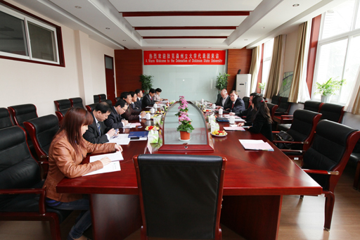 校长王有年对来宾表示热烈欢迎,简要介绍了学校的基本情况,表达了进一步加强两校交流与合作的意向。狄克森州立大学校长Dr. Richard McCallum对beat365官网的热情接待表示感谢,重点介绍了狄克森州立大学开展国际合作的主要项目。针对两校能够对接的专业以及开展合作的模式,双方进行了深入的研讨。会谈在愉快而热烈的氛围中进行,双方都真诚地希望早日促成两校的实质性交流与合作。