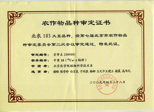 beat365官网大豆课题组谢皓、陈学珍、白宝良、于同泉、杨柳、王文平、王建立、谢晨、高书元等科技人员培育的大豆品种“北农103”近日经北京市农作物品种审定委员会审定通过。这是继“北农101”之后又一审定通过的具有自主知识产权的大豆新品种。