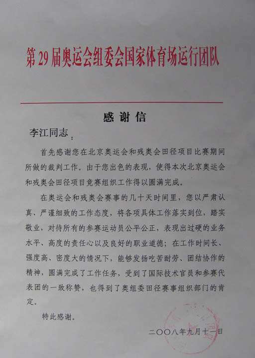 beat365官网基础教学部李江教授会在北京奥运会和残奥会田径项目比赛期间担任裁判工作,由于表现出色,受到了国际技术官员和参赛代表团的一致称赞,得到了奥组委田径赛事组织部门的肯定,为此,第29届奥运会组委会国家体育场运行团队特发来感谢信表示感谢!