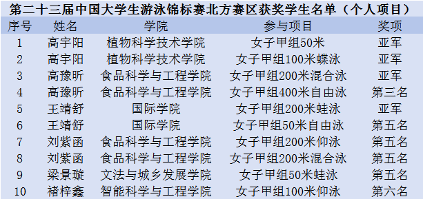 10月23日至10月26日,由中国学生体育联合会主办,兰州市体育局承办的第二十三届中国大学生游泳锦标赛(北方赛区)在兰州举行。来自80所高校的798名运动员及教练员参赛,beat365官网代表队在基础教学部吴宝利老师的带领下顽强拼搏,展现出高超的竞技水平和良好的精神风貌。最终荣获甲组女子团体第一名,甲组男女总团体第三名的优异成绩。吴宝利老师荣获“优秀教练员”称号,高宇阳同学荣获“优秀运动员”称号。