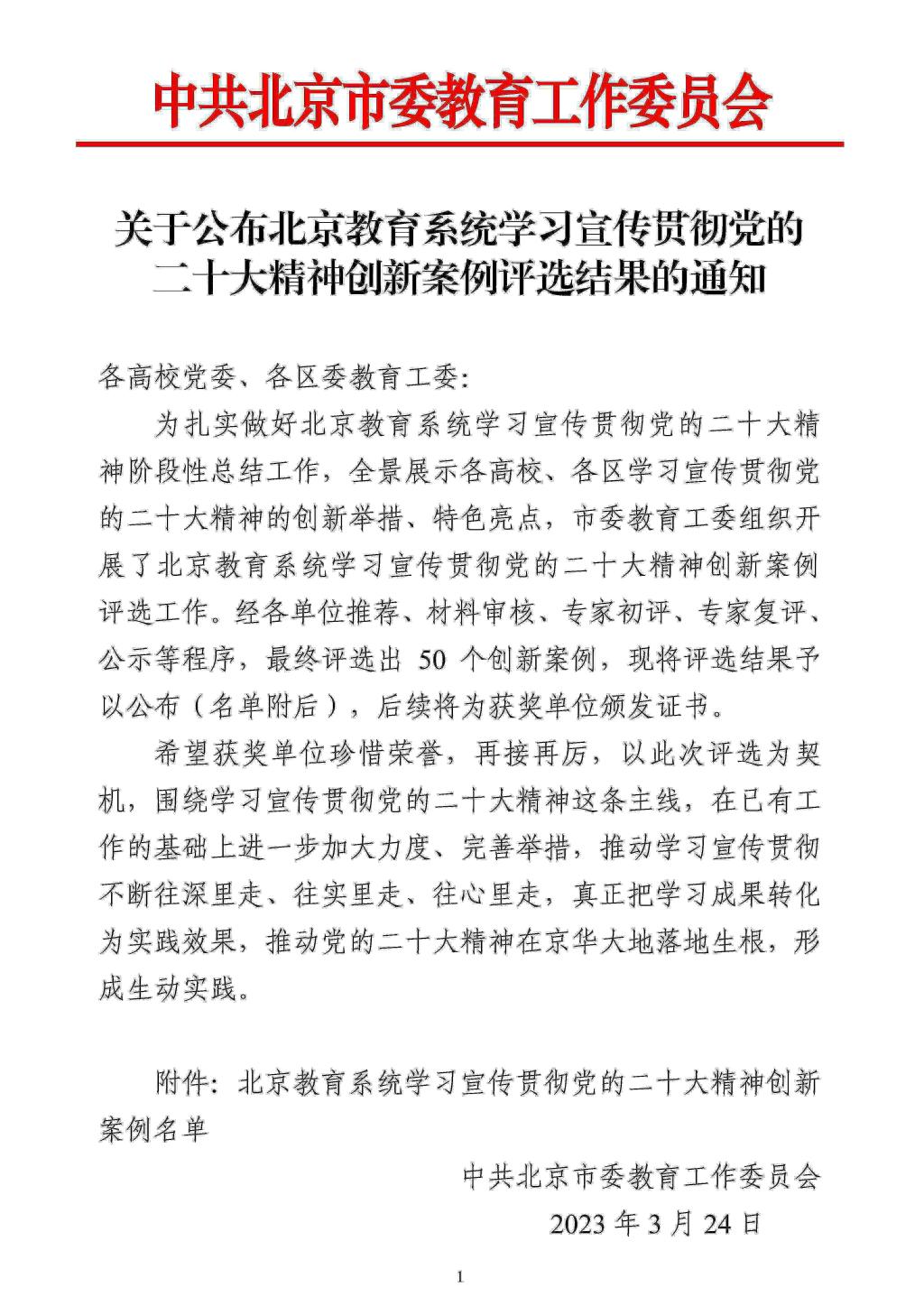 近日,北京市委教育工委公布了北京教育系统学习宣传贯彻党的二十大精神创新案例评选结果,beat365官网报送的案例“推动党的二十大精神在师生服务乡村振兴的生动实践中开花结果”入选。