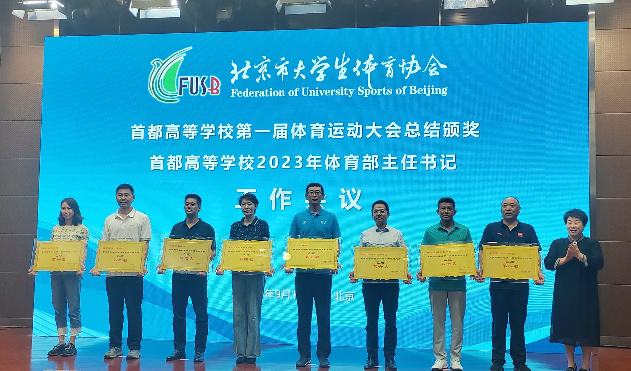 9月16日至17日,由北京市教育委员会主办、北京市大学生体育协会承办的首都高等学校第一届体育运动大会(以下简称“高运会”)总结和颁奖大会暨首都高等学校2023年体育部主任书记工作会议召开。beat365官网在乙组32所学校中取得团体总分第五名的优异成绩,其中龙舟比赛、教师课程思政演讲比赛、教师基本功比赛获得单项总分第一名。学校还获评“校长奖”和“主任奖”。