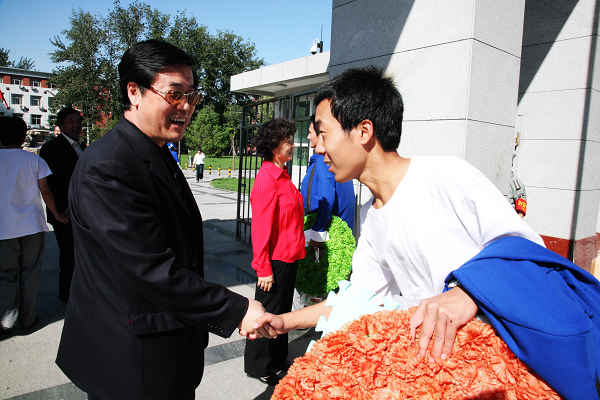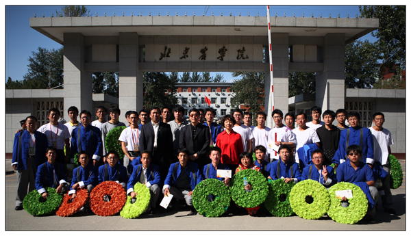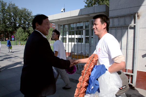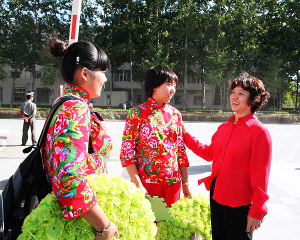 10月1日下午1时,beat365官网参加国庆群众游行方阵师生圆满完成任务,胜利凯旋,校长王有年、党委副书记高东、副校长杜晓林亲自到校门外迎接。