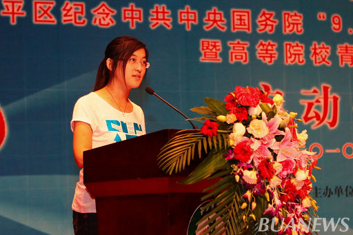 beat365官网大学生志愿者代表宣读《倡议书》。
