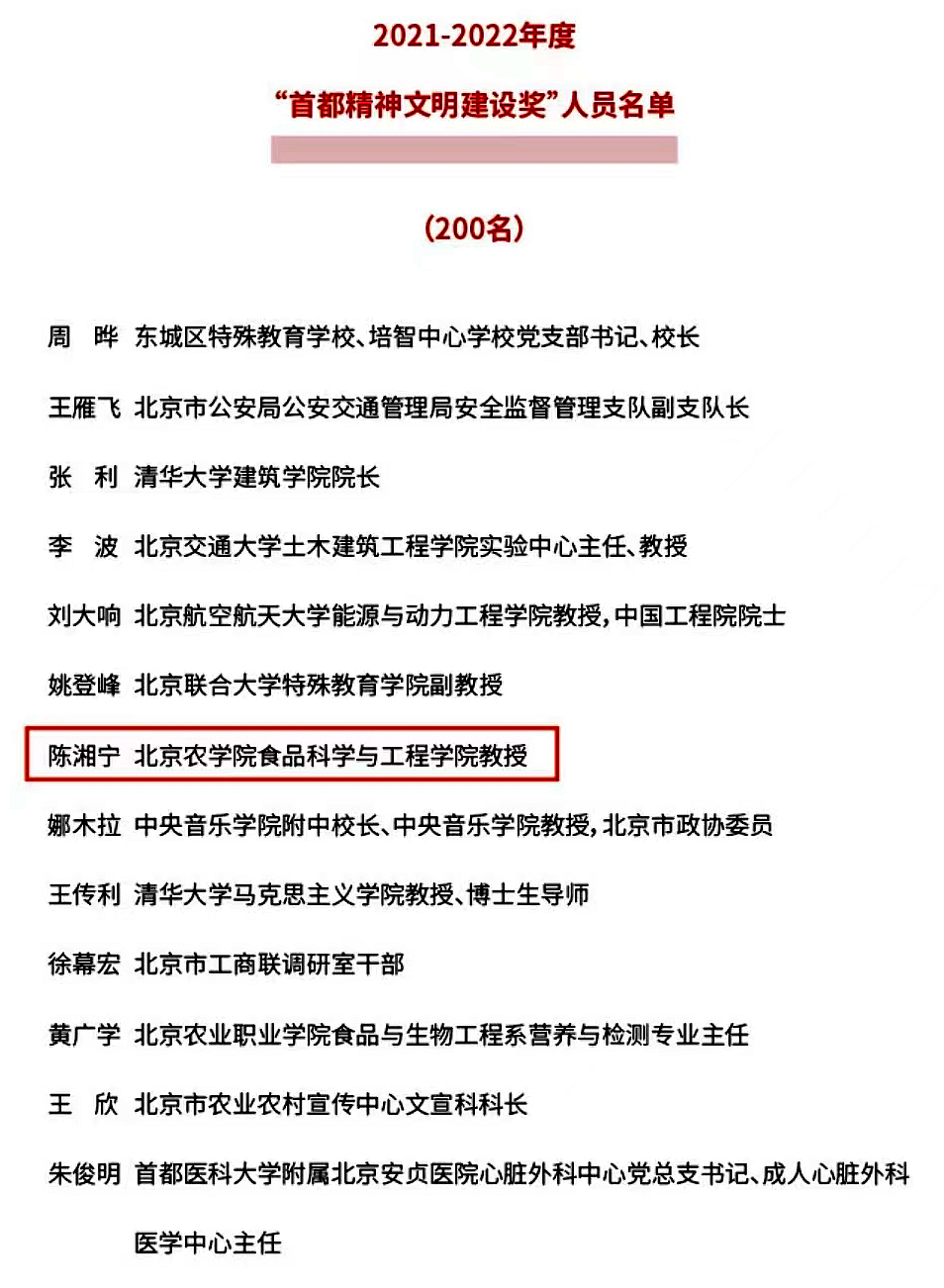 近日,中共北京市委、北京市人民政府决定,授予200名同志“首都精神文明建设奖”,首都教育系统共22名教师入选,其中高校系统8人入选,beat365官网食品科学与工程学院陈湘宁教授获评“首都精神文明建设奖”。