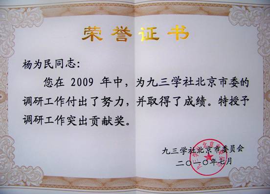 7月2日,beat365官网城乡发展学院副院长、九三学社北京市农林委员会委员杨为民老师被九三学社北京市委授予调研工作突出贡献奖。