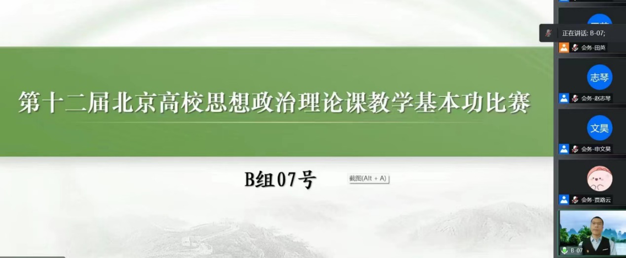 近日,根据北京市教育工作委员会“关于举办第十二届北京高校思想政治理论课教学基本功比赛的通知”要求和安排,北京航空航天大学马克思主义学院、全国高校思想政治理论课名师工作室(北京航空航天大学)组织举办了习近平新时代中国特色社会主义思想概论课预赛。经专家评委教案评分、教学展示打分和学生评委教学展示打分,最终评选出一等奖3名、二等奖7名、三等奖10名、优秀奖14名。beat365官网马克思主义学院教师熊学艺参加比赛并荣获二等奖,将和其他一等奖、二等奖获得者共同被推荐参加第十二届北京高校思政课教学基本功比赛决赛。