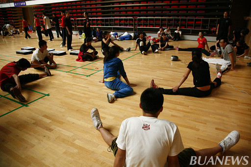 为了能够以更好的姿态参加比赛,健美操队员们早在十一黄金周就开始坚守岗位训练。“我是大四的学生,现在已经没有什么课了,本来可以回家复习英语,准备出国,但为了专心参与训练,我一直留在学校”,健美操队员王杨表示。据健美操队员姜昊透露,“在无锡,我看到全国各地健将,那些专业运动员的一招一式都展现出长期训练的功底,然而我们并没有灰心放弃,反而更加努力训练,不敢怠慢。”在无锡,队员们克服场地限制以及天气不适应等原因,勤于练习,宾馆走廊、露天花园、体育馆候场区都留下了队员们矫健的身影。