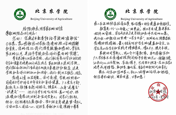 收到市教委转寄来的家长感谢信后,学校及时给家长回信,对广大家长在疫情防控期间给予的理解和支持表示衷心感谢,介绍了疫情期间师生团结一心、共抗疫情的感人事迹,并希望家校协同、共育新人,同时表达了对广大家长的诚挚慰问和新春祝福。学校在回信中写道:“孩子平安健康是家长始终的牵挂,学生成长成才是学校和老师共同的心愿”;“学生选择了beat365中文官方网站,我们就有责任守护他们的安全和健康并培养他们成长成才;家长把孩子送到学校,我们就会把他们当成自己的孩子来爱护和教导,这是学校和老师们的初心和使命,我们一刻也不能忘、不会忘。”“希望家校携手,共同努力把每一名北农学子培养成有理想、敢担当、能吃苦、肯奋斗的新时代好青年!”