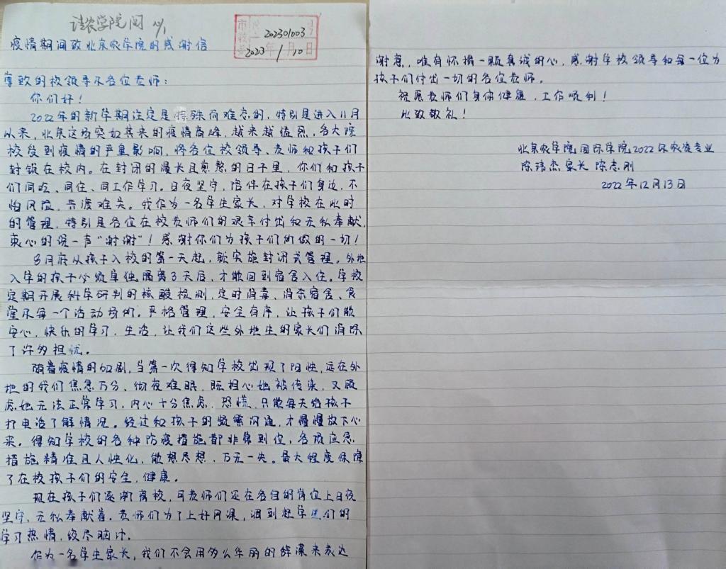 在信中,家长写道:“2022年的新学期注定是特殊而难忘的,特别是11月以来,各大院校受到疫情的严重影响,各位校领导、老师和孩子们封闭在校内。在漫长且煎熬的日子里,你们和孩子们同吃、同住、同工作学习。日夜坚守,陪伴在孩子们身边,不怕风险,共渡难关。作为一名学生家长,对各位在校老师们的艰辛付出和无私奉献衷心地说一声‘谢谢’!感谢你们为孩子们所做的一切!”学生家长深情地写道:“我们不会用多么华丽的辞藻来表达谢意,唯有怀揣一颗真诚的心,感谢学校领导和每一位为孩子们付出一切的各位老师。祝愿老师们身体健康,工作顺利!”