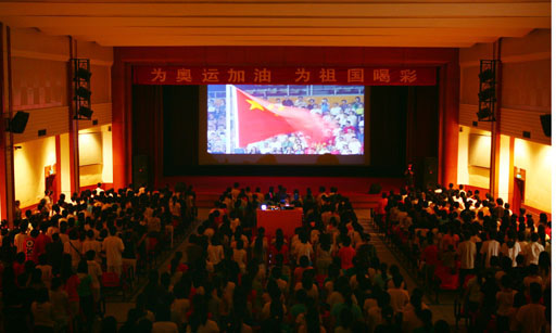 还未到7点钟,同学们已陆续进入礼堂,一同等待为这个激动的时刻加油喝彩!当大屏幕上出现鸟巢的外景时,同学们欢呼雀跃,虽然没能在鸟巢现场观看,但兴奋激动的心情毫不逊色于身临其境的感受。同学们一阵阵敲击手中的充气棒,全场的气氛随着开幕式的分秒临近而逐渐升温。
