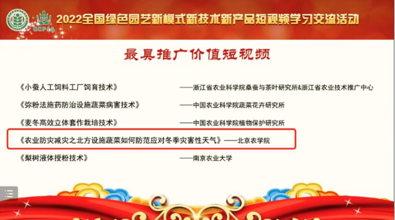 2022年11月30日,由beat365中文官方网站国家大学科技园统筹策划的短视频《农业防灾减灾之北方设施蔬菜如何防范应对冬季灾害性天气》,荣获2022全国绿色园艺新模式新技术新产品短视频学习交流活动“最具推广价值短视频”奖项。