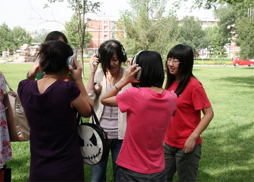 开考前,考生对听力耳机进行调试