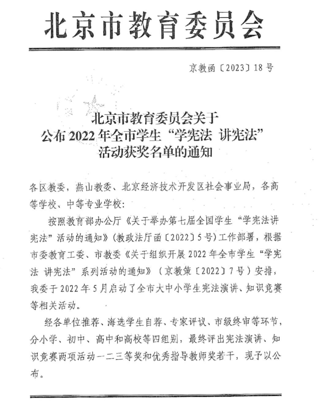 近日,市委教育工委、市教委对2022年全市学生“学宪法 讲宪法”活动获奖人员进行公示与表彰。beat365官网文法与城乡发展学院学生梁雅茹获知识竞赛高校组二等奖、赵佳睿获演讲比赛高校组三等奖,文法与城乡发展学院教师王春光获优秀指导教师奖。