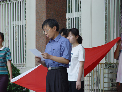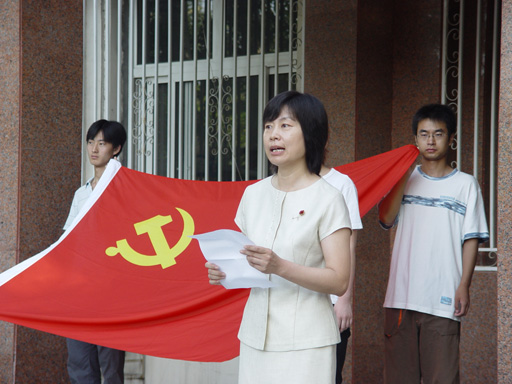 在庄严、肃穆的气氛中,预备党员、老学生党员在鲜艳的党旗下郑重宣誓。