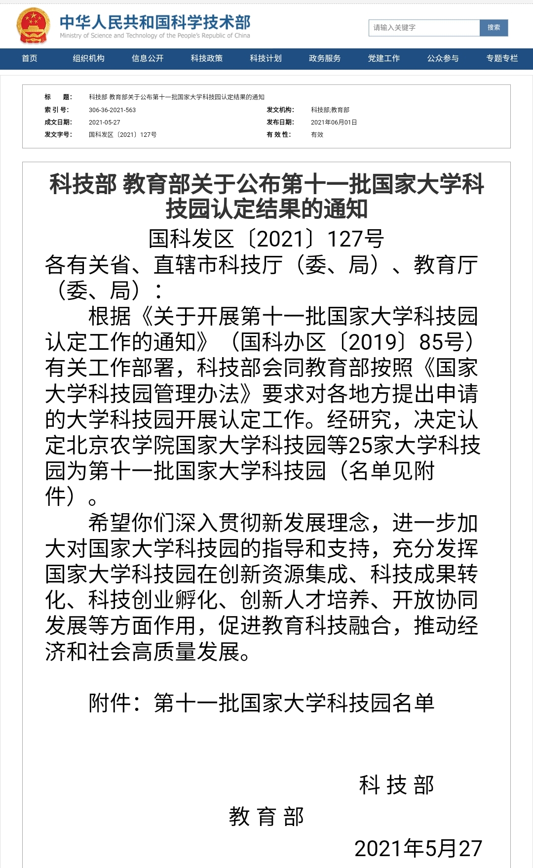 5月27日,科技部、教育部联合发布《科技部、教育部关于公布第十一批国家大学科技园认定结果的通知》(国科发区〔2021〕127号),beat365官网大学科技园被认定为国家大学科技园。