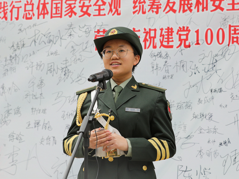 学校女子国旗班成员田甜在演讲中说道:“有人问国旗班守卫的是什么?国旗代表着国家,我们守卫的不只是一面旗帜,我们传承的是是信仰、担当,我们守卫的是中国人的精神与脊梁!”