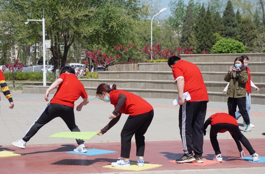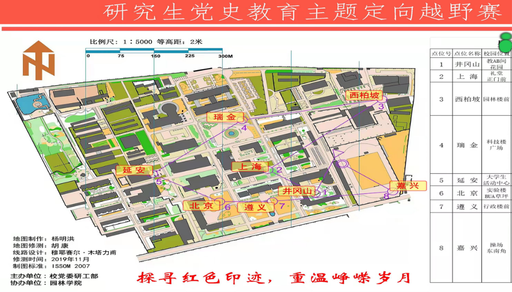 本次比赛分设男子组和女子组,另外研工部和各学院研工老师也组队参与体验了比赛。师生共43组队伍,每组由3人组成,间隔1分钟先后出发。比赛设置了上海、西柏坡、瑞金、延安、北京、遵义、井冈山、嘉兴八个打卡点,代表中国共产党发展历程中八个重要的革命历史发生地。按照比赛下发既定路线图上的点位顺序,依次到八个点位完成有关党史知识问答、游戏等任务后进行打卡。在历时近一个小时的竞赛过程中,运动员们团结协作、奋勇争先,最终全部顺利完成任务,抵达终点。