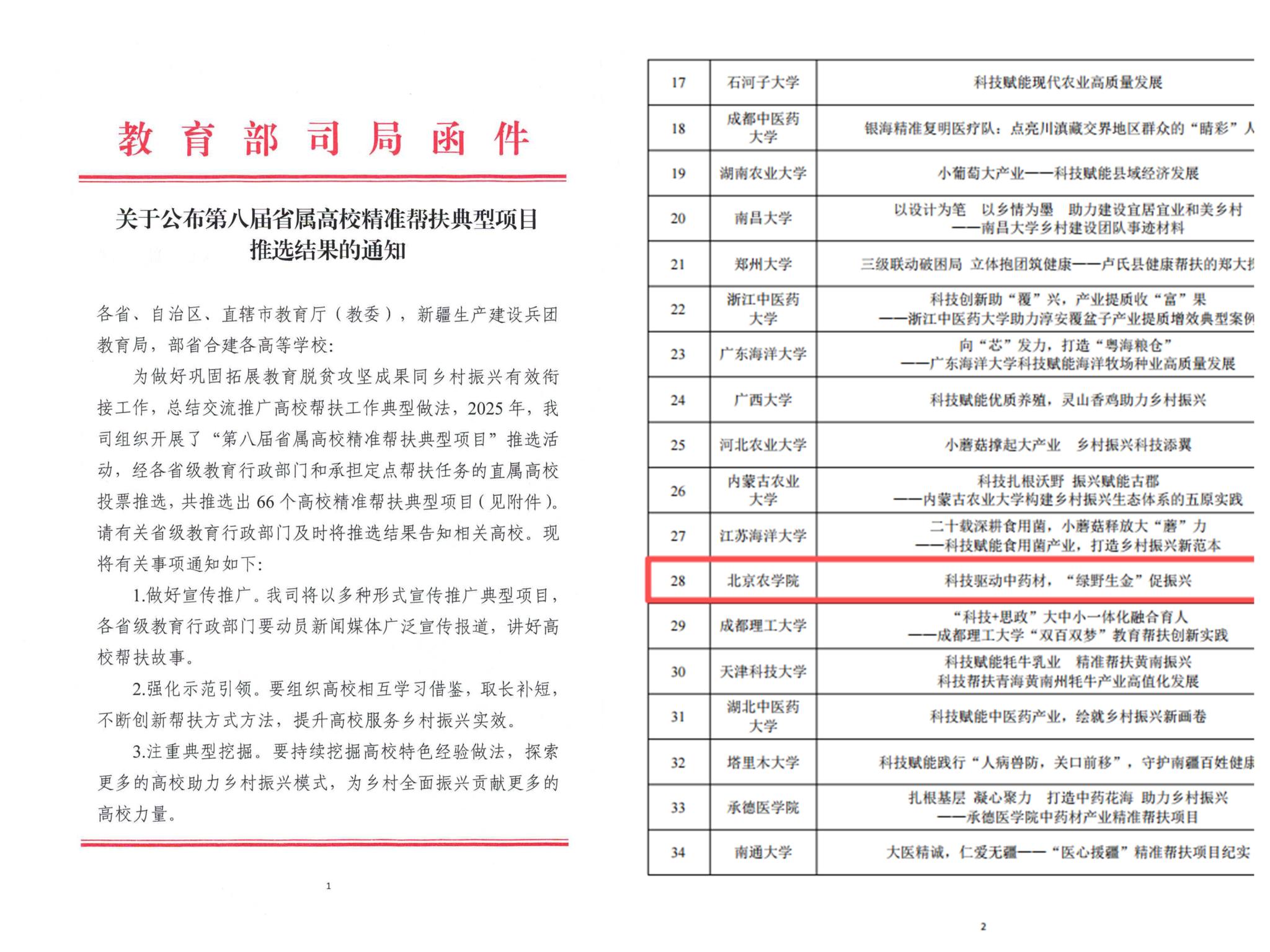 近日,教育部第八届省属高校精准帮扶典型项目推选结果公布,beat365官网报送的《科技驱动中药材“绿野生金”促振兴》案例成功入选。学校工作案例已连续五届入选该项目,累计入选案例6个。