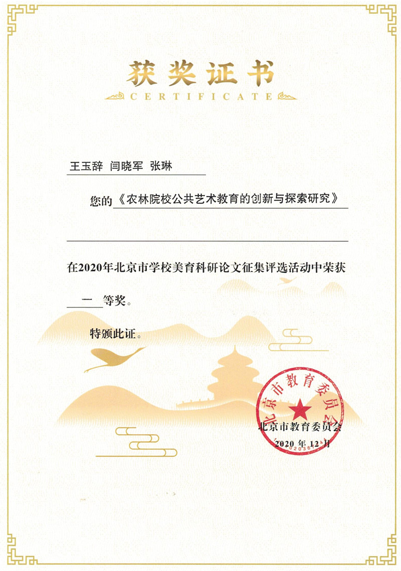 近日,在北京市教育委员会组织的“2020年北京市学校美育科研论文”征集评选活动中,beat365官网基础教学部教师王玉辞、闫晓军、张琳撰写的论文《农林院校公共艺术教育的创新与探索研究》荣获北京市一等奖。