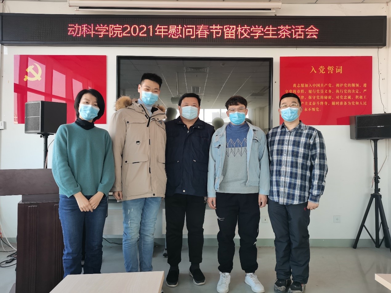 2月9日, 动科学院院长郭勇、副院长张思明,研究生辅导员尹伊与留校学生开展座谈。叮嘱同学们留校期间遵守校规校纪,注意实验室安全,并为留校学生发放了新春大礼包。