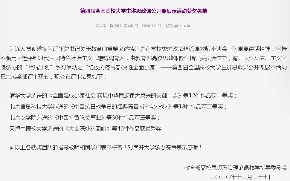 12月27日,由教育部高等学校思想政治理论课教学指导委员会主办,南开大学马克思主义学院承办的“绽放抗疫青春,决胜全面小康”——第四届全国高校大学生讲思政课公开课展示活动总决赛落下帷幕。
