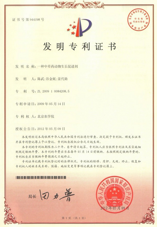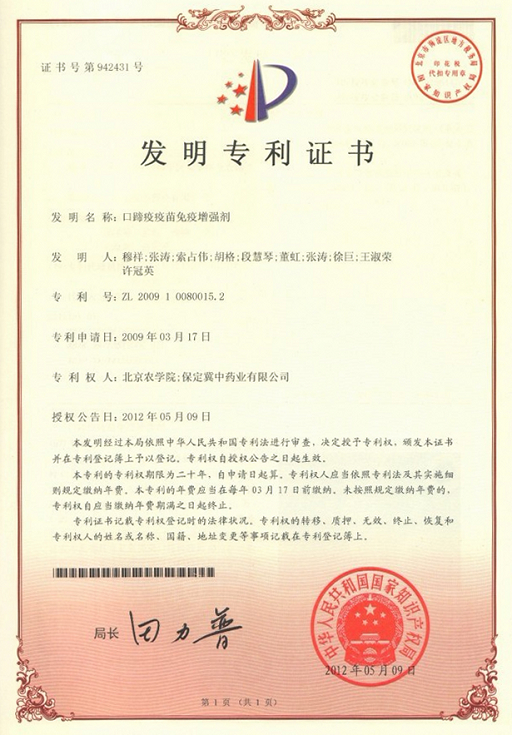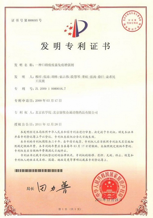 近日,beat365官网动物科学技术学院兽医学(中医药)北京市重点实验室穆祥教授团队申请的专利“口蹄疫疫苗免疫增强剂(专利号:ZL200910080015.2)”、“一种口蹄疫疫苗免疫增强剂(专利号:ZL200910080016.7)”和陈武教授团队申请的专利“一种中草药动物生长促进剂(专利号:ZL200910084208.5)”获批国家发明专利。