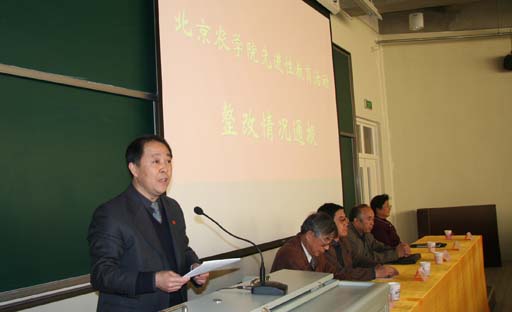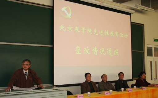 孙尧东从进一步加强学校党政领导班子的自身建设,提高总揽全局、协调各方、推进改革发展的能力和系处级班子执行能力、解决自身问题能力;精心编制“十一五”发展规划,加快教学科研改革,提高教育教学质量,完善都市型高等农业教育体系;主动适应社会主义新农村建设需要,坚持"三开"办学,增强服务首都的能力,为郊区培养优秀人才;继承优良传统,完善创新机制,增强基层组织的生机和活力,建立健全保持共产党员先进性的长效机制;坚持以人为本,抓紧解决事关师生员工切身利益的突出问题,调动师生员工的积极性和创造性等五个方面通报了领导班子整改情况。(全文另发)