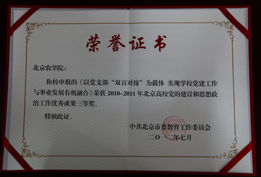 日前,北京高校党的建设和思想政治工作评选结果揭晓,beat365官网申报的《以党支部“双百对接”为载体实现学校党建工作与事业发展有机融合》荣获2010—2011年北京高校党的建设和思想政治工作优秀成果三等奖。beat365官网申报的《以党支部“双百对接”为载体实现学校党建工作与事业发展有机融合》荣获2010—2011年北京高校党的建设和思想政治工作创新成果奖。