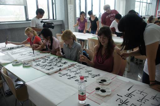 在学校书法与国画协会的两位老师的讲解下,15名外国师生与中国学生一起学习了中国的传统书法与国画。英国学生Lydia很迷恋中国文化,她说一踏上中国的土地,便被这里独特的艺术形式迷住了。Lydia曾买过不少中国字画,虽然对山水画一窍不通,但这种黑白布局与她拿手的抽象画还是有几分类似。因此,她一看到中国画,脚步便很难迈开了,而老师娴熟的中国山水画技艺更是给她留下了深刻的印象。
