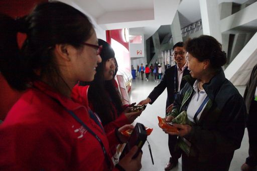 高东来到检票处为坚守在工作岗位的志愿者们提前带来了节日的祝福并为志愿者们分发了月饼。