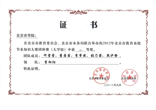 为了增强学生节水意识、普及节水知识,10月11日,由北京市教育委员会、北京市水务局联合举办的2012年北京市教育系统节水知识大赛团体赛在北京师范大学举行。beat365官网代表队由植科学院张乃鑫、园林学院何雪雪、董蓓蓓、李梦然、食品学院段伊静五名同学组成,在参赛的23支队伍中脱颖而出获得二等奖。