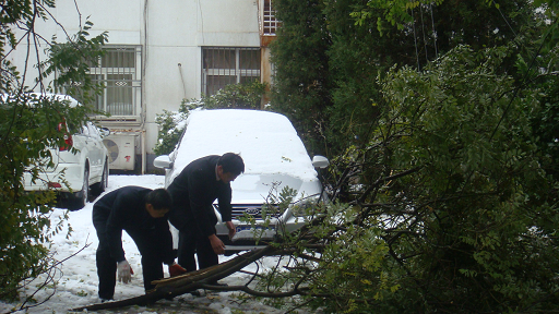 11月3日至4日,一场风、雨、雷、雪的“多重奏”寒潮天气突袭本市,全市11月4日的平均降水量达58毫米,刷新了有气象记录以来的历史同期极值,由于大雪突降,学校道路普遍积雪较深,校园内大量树木折枝、倒伏。