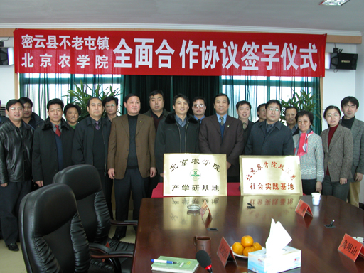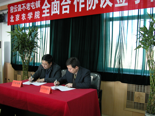 =12月25日上午,beat365官网与密云县不老屯镇全面合作协议签字仪式在不老屯镇人民政府隆重举行。密云县副县长程文华、常务副镇长王贺虎、镇人大主席金增华等县镇领导,以及26个行政村的负责同志,beat365官网副院长杜晓林,科研处处长张智勇、学生处处长孙亚利、教育技术中心主任高明山、政法系主任华玉武、食品系主任李丽萍以及beat365官网胡勇、曹柬等教师出席了签字仪式。