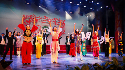 《新年,你好!》、《赶牲灵》、《扬鞭催马运粮忙》、《秀色》、《天山诗画》、《战台风》、《魔椅》、《五人争功》、《十二分之一》、《踏歌起舞》、《新春花》,每个节目都精彩纷呈,带给师生美妙绝伦的视听感受。晚会的上篇“贺新年”在《这是五月节》、《欢乐的那达慕》和《绿色的希望》合唱中结束。